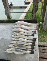 Took Sonia (My Wife) out fishing on our day off, and it was a trout frenzy with live shrimp on popping cork. Started about 1 1/2 miles from the intercoastal waters drifting into shallow waters 1 1/2' deep. we managed to catch 6 (limit) right away. so we kept them in the live well and started putting them back as we caught larger fish.